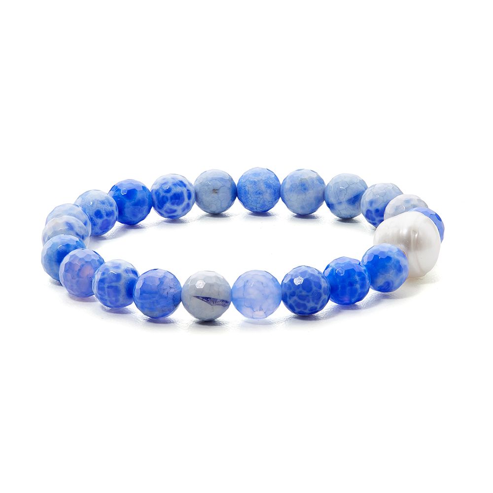 7" of faceted blue agate beads with a freshwater pearl on stretch.