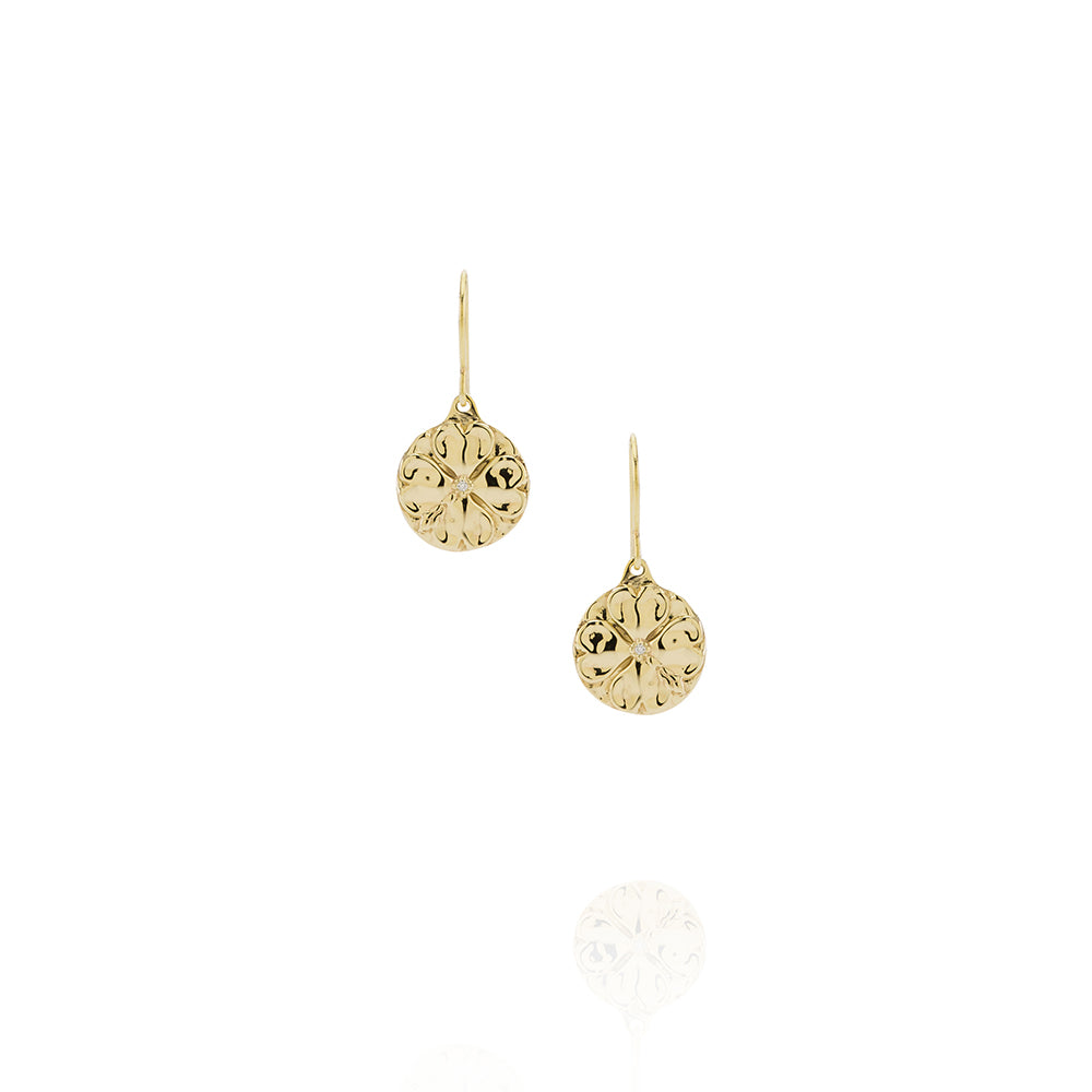 Handmade petite 14 kt gold and diamond dogwood earrings with 14 kt gold ear wires. Gold Sparrow Project Products are handmade. Allow 4-6 weeks time for production plus shipping.