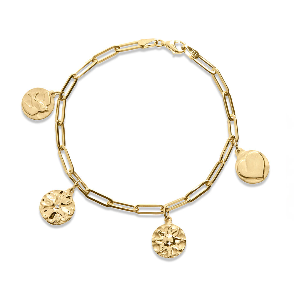 14 karat gold Sparrow Project Collection Charms (sparrow, dogwood, sunburst and heart) bright polished with sandblasted background on solid gold link chain bracelet. Allow 4-6 weeks for production plus shipping.
