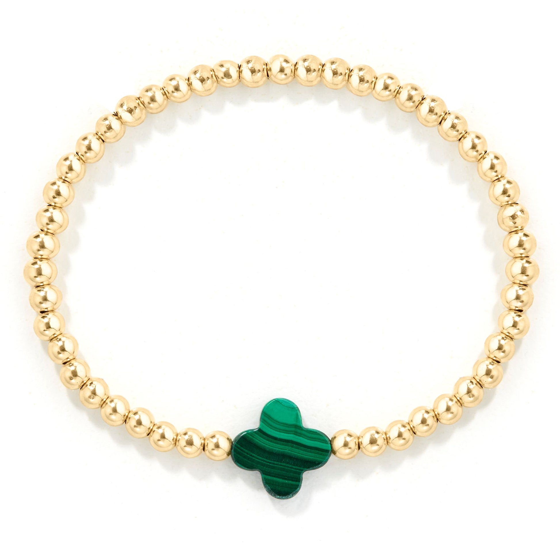 Gold plated beads on stretch with a malachite clover cross. This bracelet is the perfect addition to a well curated Personalized Joy Stack or simple and elegant when worn alone.