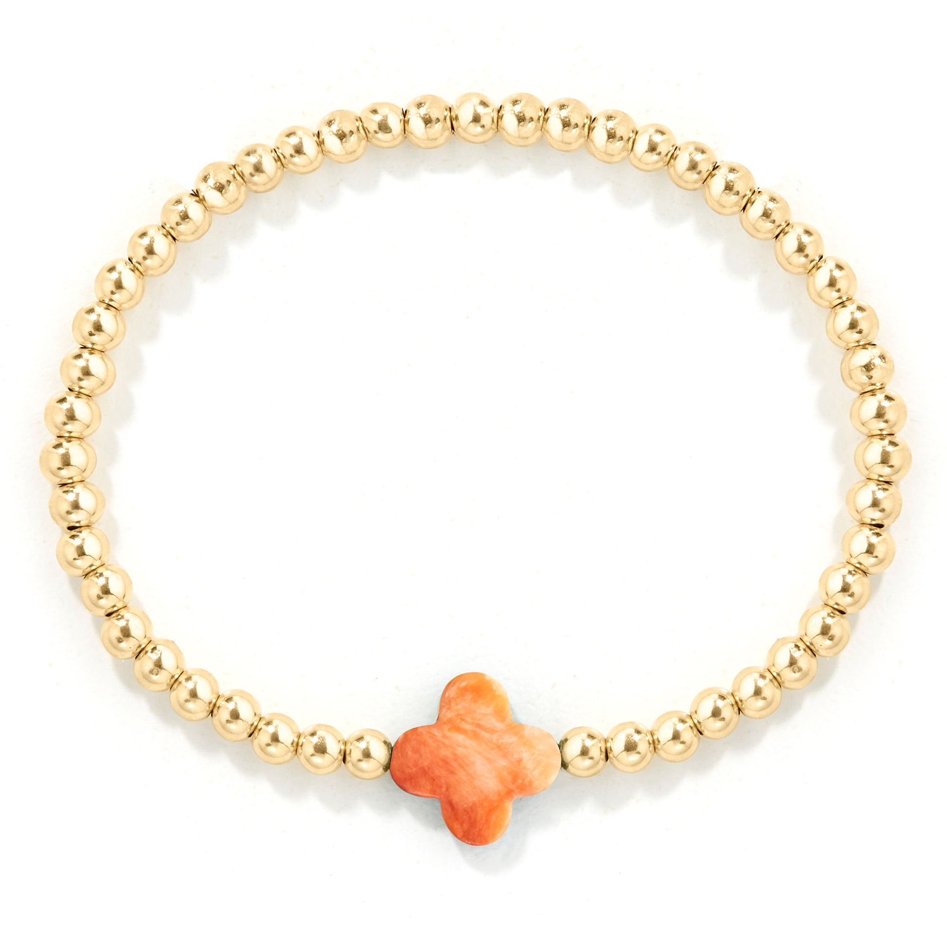 Gold plated beads on stretch with a coral clover cross. This bracelet is the perfect addition to a well curated Personalized Joy Stack or simple and elegant when worn alone.