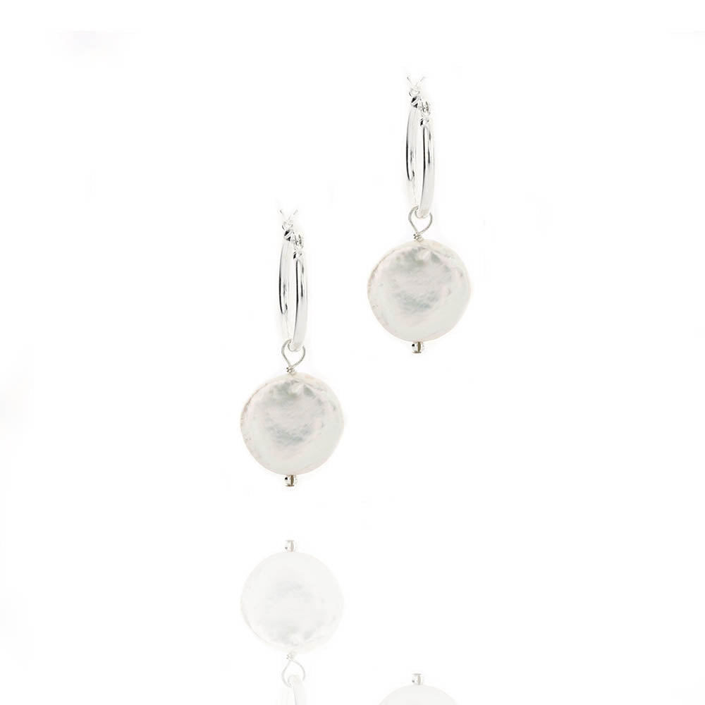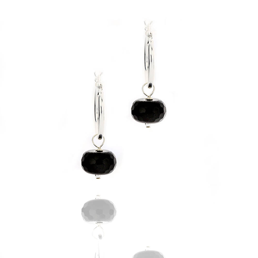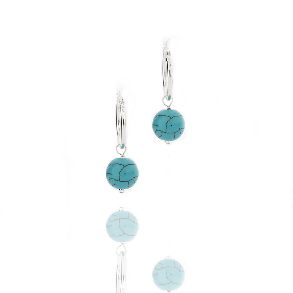 Sterling silver hoops with three handmade charms in turquoise magnesite, faceted jet and coin pearl. HALOS AND HALO Babies include the three interchangeable bead charms shown.