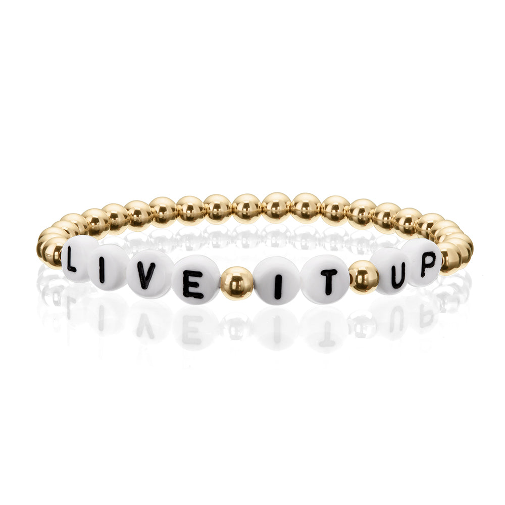 Gold plated beads on stretch with nameplate in plastic, white bubble letters. This bracelet is both elegant and fun. To personalize your bracelet, simply purchase and submit the name, word of intention or mantra you choose in the message section. And, if you want a plastic, heart bubble letter, let us know. Now, isn’t this fun!