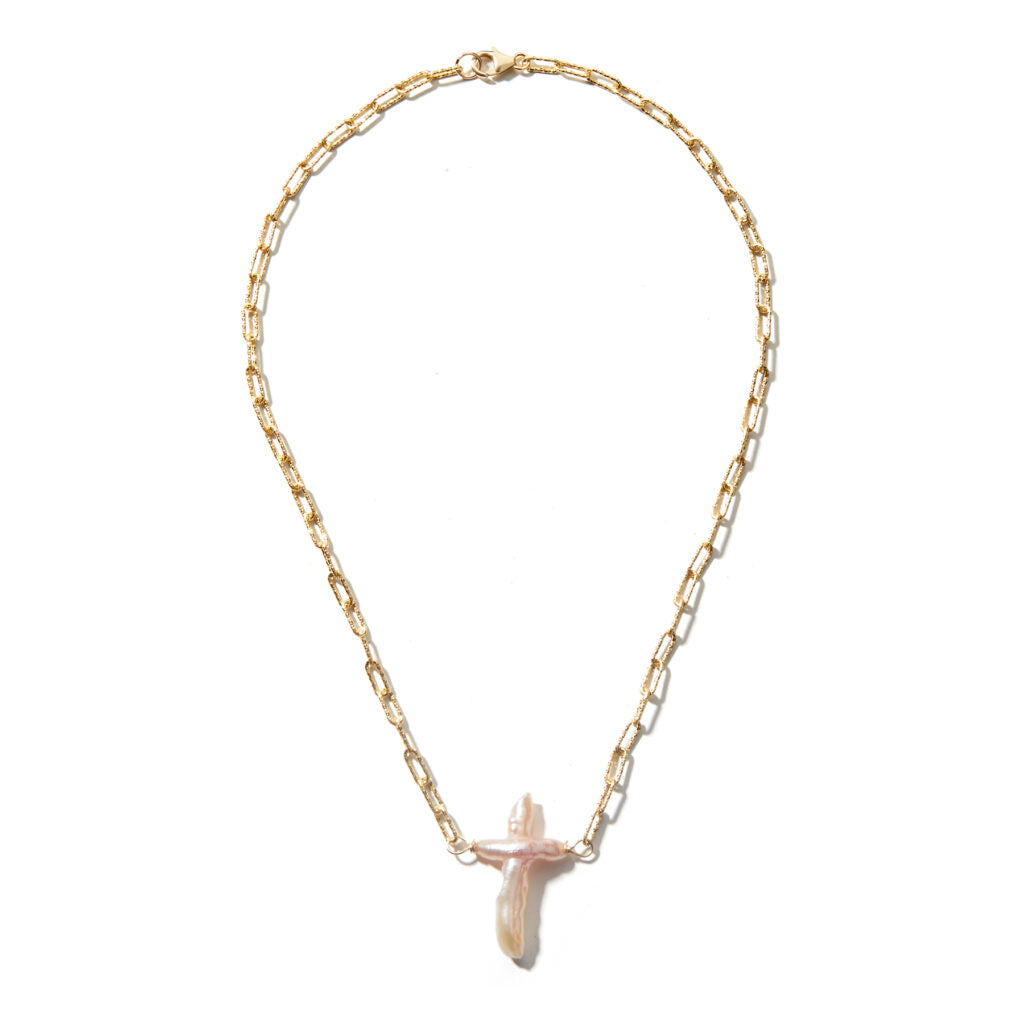 Pink pearl cross on 18″ of gold over silver paperclip chain with a lobster clasp. This divine design is sweet, sassy and very unique.