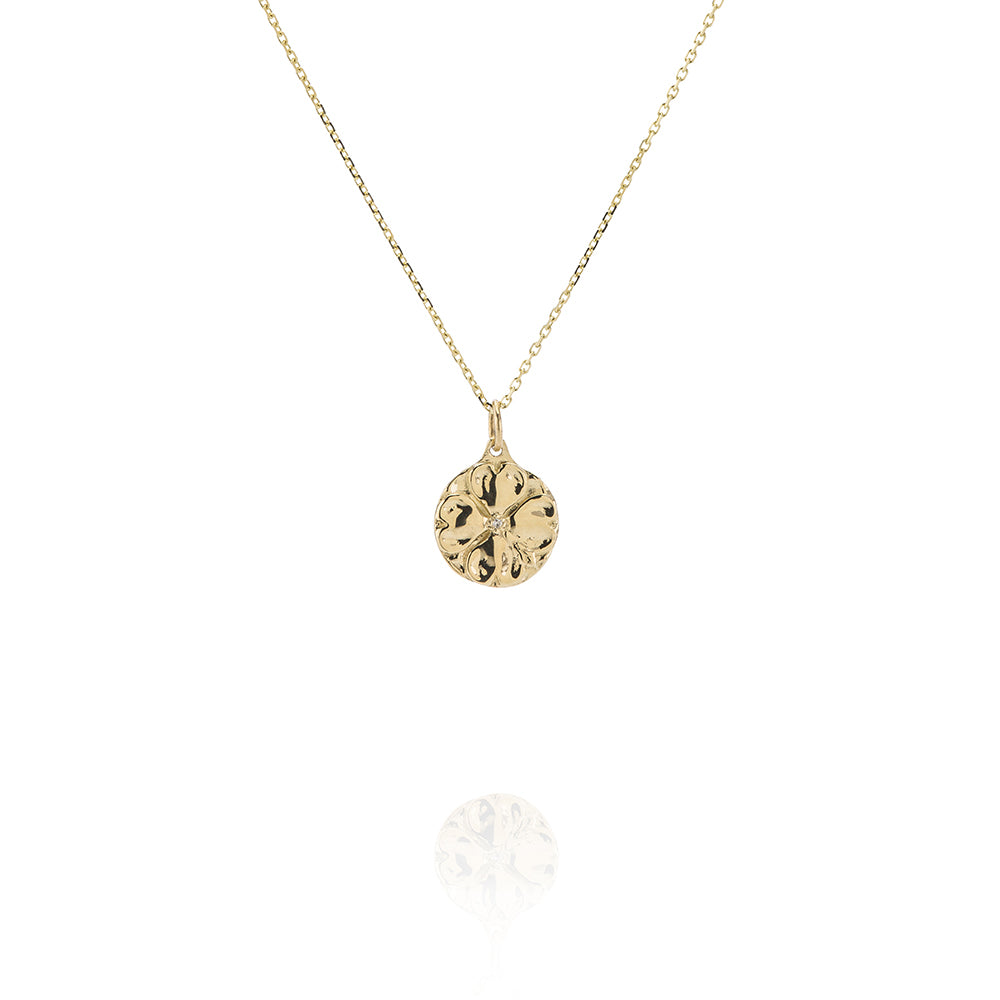 Handmade small 14 kt gold and diamond dogwood charm on 18” diamond cable chain with lobster clasp. Gold Sparrow Project Products are handmade. Allow 4-6 weeks time for production plus shipping.