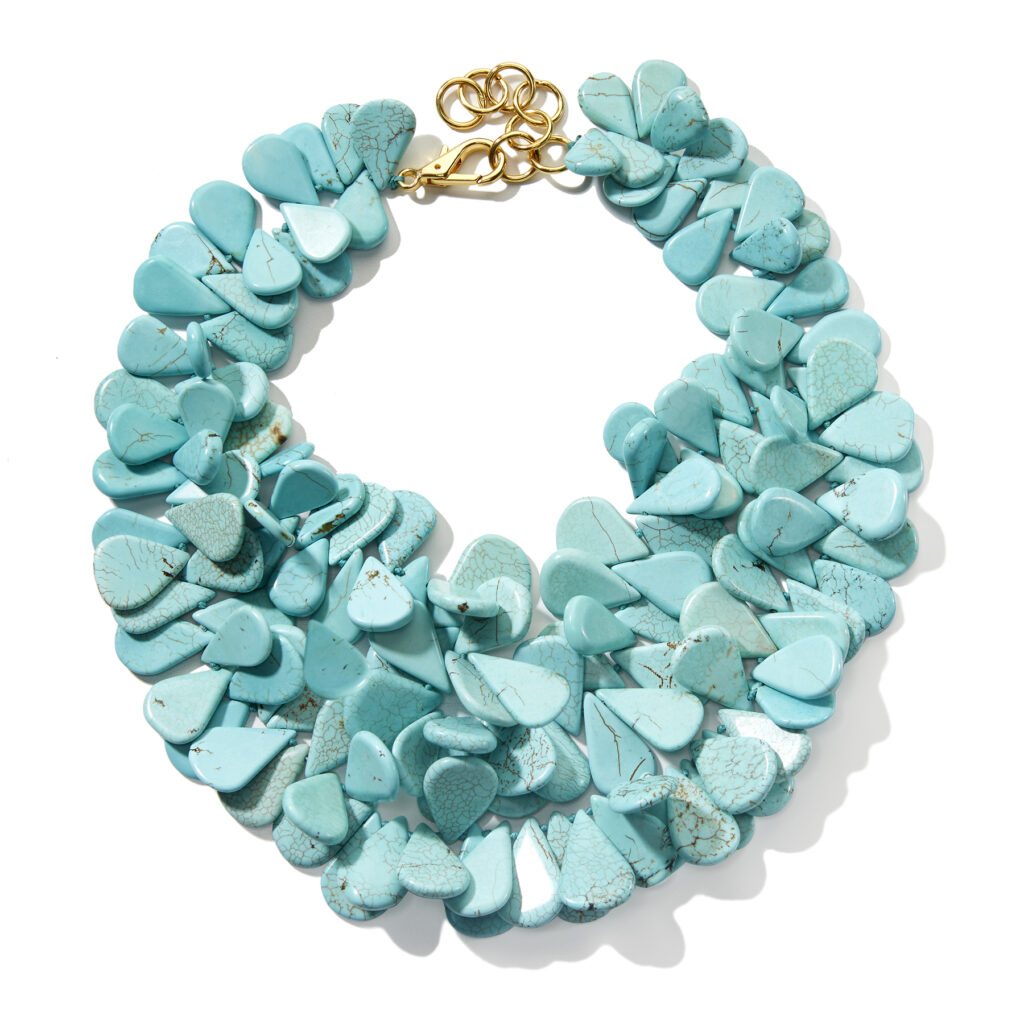 18″ of turquoise briolette beads knotted by hand on silk. The color of turquoise is mesmerizing and our minimalistic version of knotting a double strand necklace makes it bold yet wearable. The clasp on this necklace allows it to expand up to six more inches.